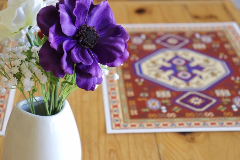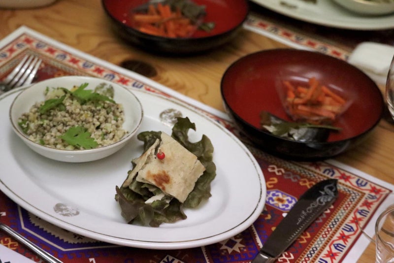 アルメニア絨毯モチーフのランチョンマット上に南会津産の食材で彩るアルメニア風料理。